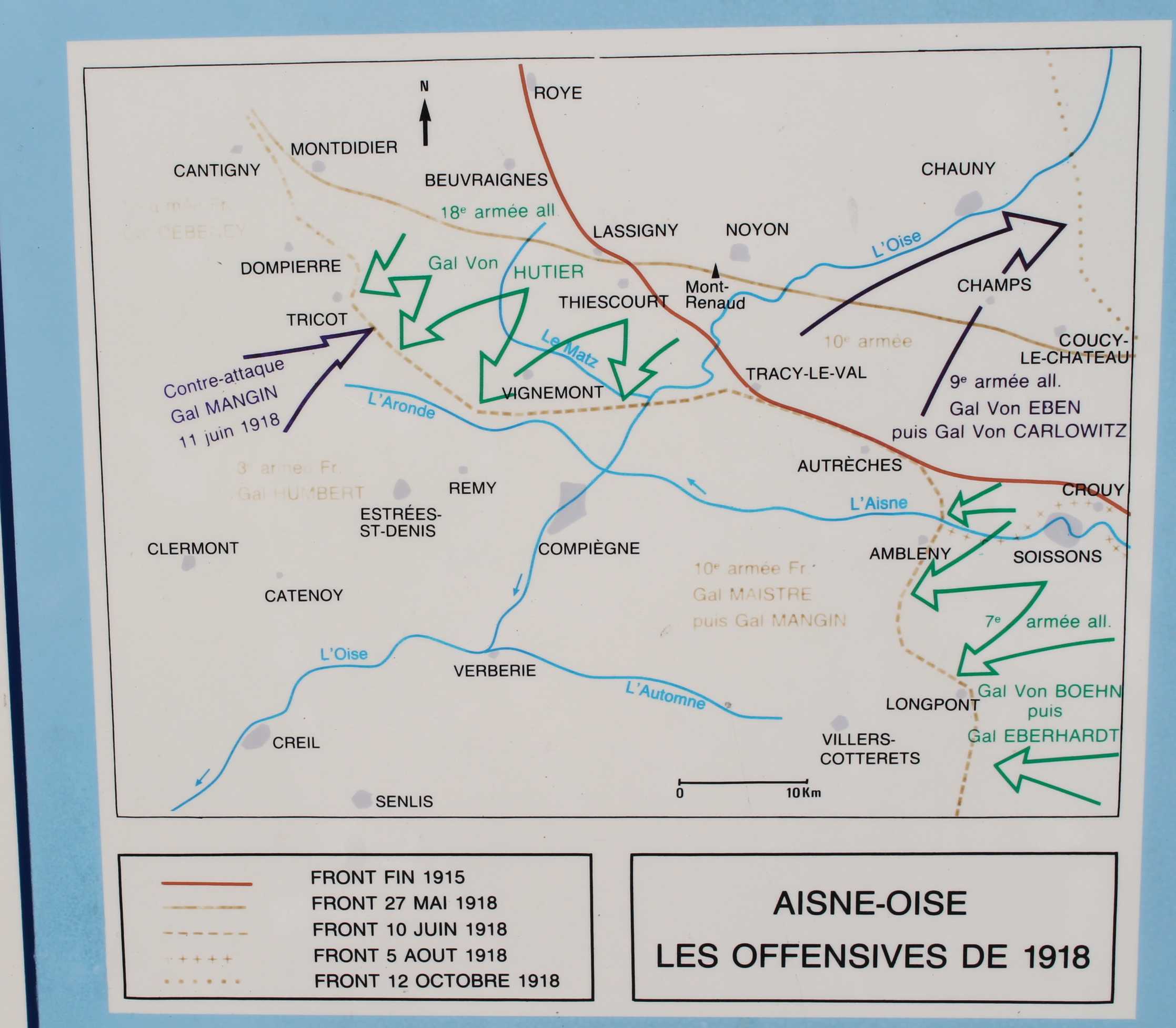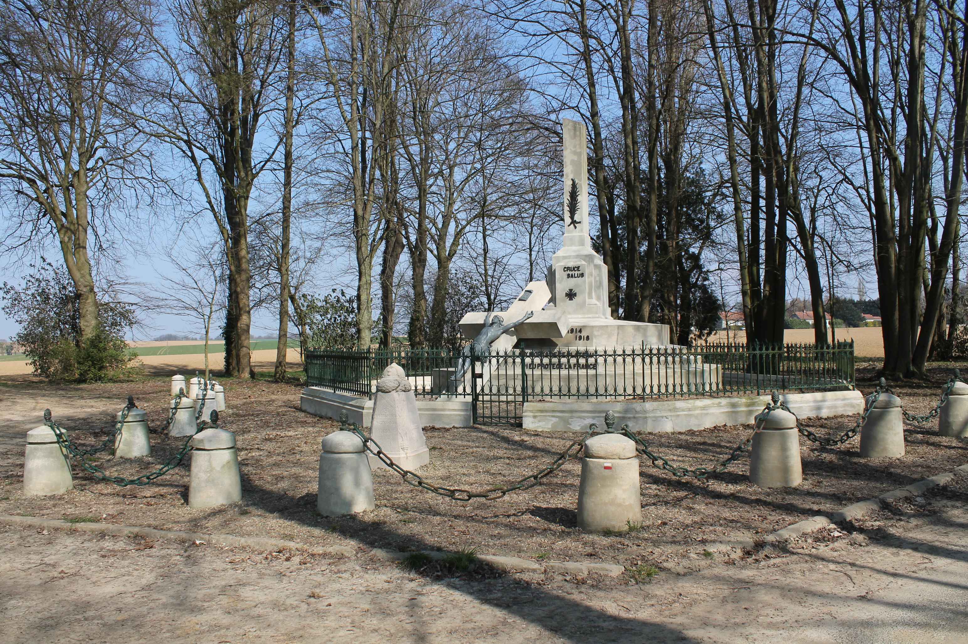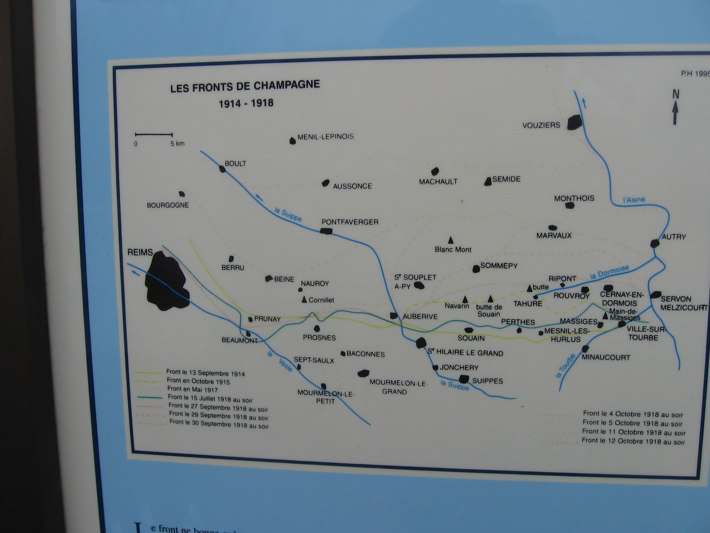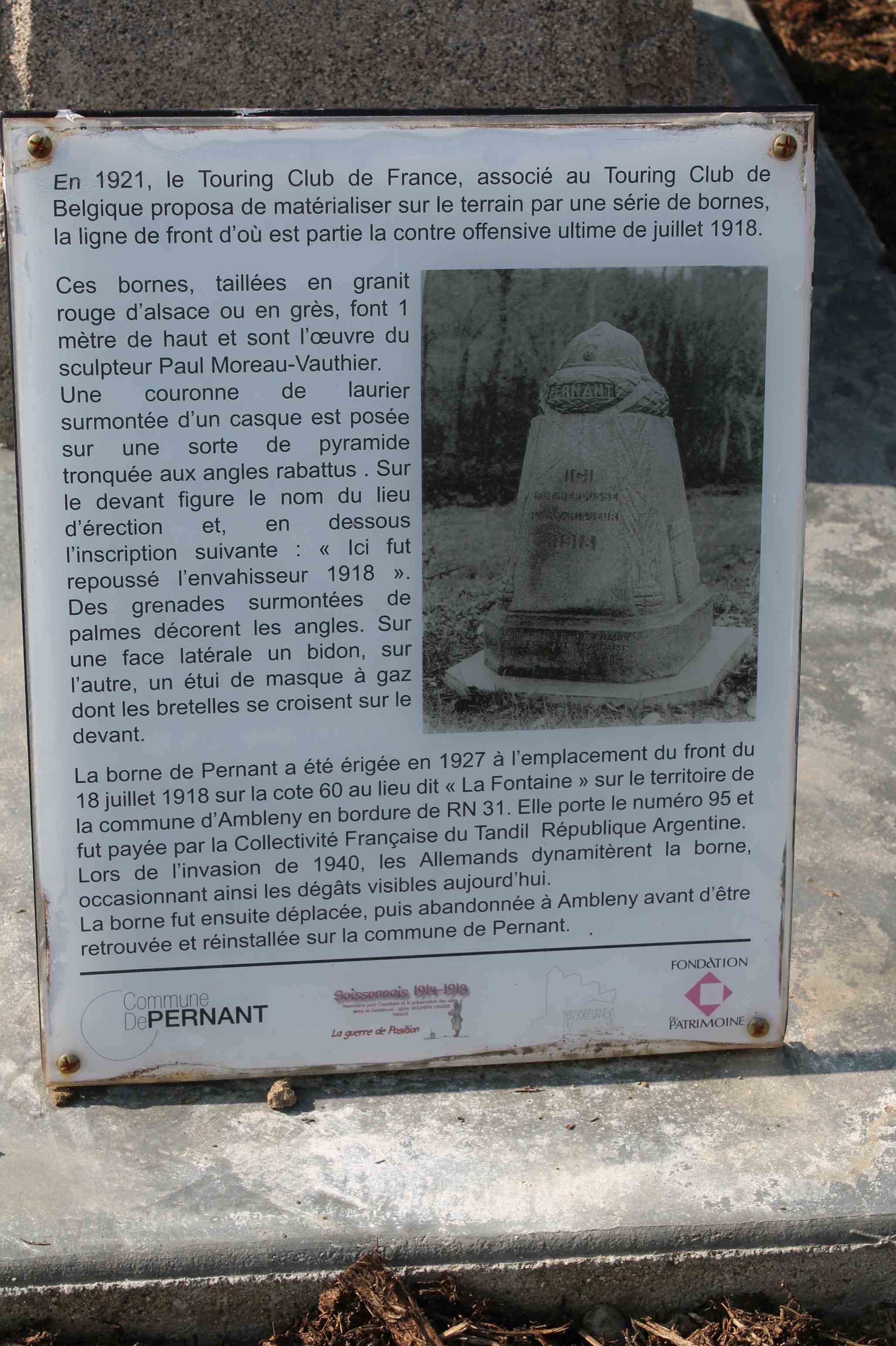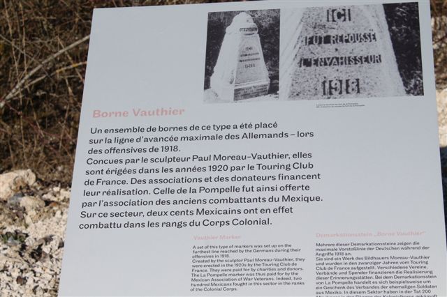 Les bornes Vauthier furent érigées entre 1921 et 1927 afin de matérialiser la ligne de front telle qu'elle était le 18 juillet 1918, au début de la dernière grande offensive de la Première Guerre mondiale. 240 bornes furent envisagées, de la Mer du Nord à la frontière suisse, entre Nieuwpoort en Belgique et Mooslargue près d'Altkirch/Belfort à la frontière franco-suisse. Les fonds recueillis ne permirent d'en installer que la moitié. Aujourd'hui, 96 des 120 bornes initiales sont encore érigées, dont 19 en Belgique. Circuit décrit par Pascal G. (77) en janvier 2014. V1.11 du 25-03-2015 ~~~ Les prises de vues aériennes proviennent du site Géoportail de l'IGN et peuvent être téléchargées ou achetées : http://www.geoportail.gouv.fr/accueil. Remarques sur les photos aériennes téléchargées : - compte-tenu du format JP2 et de la taille de chaque photo téléchargée, il peut être nécessaire d'utiliser un gestionnaire de photos adapté, - généralement, les prises de vues s'effectuent d'Est en Ouest ou d'Ouest en Est. Il est donc nécessaire d'orienter la photo au Nord. Exemple : si la photo est prise d'Est en Ouest, le Nord est à droite, il faut donc faire une rotation de 90° à gauche.