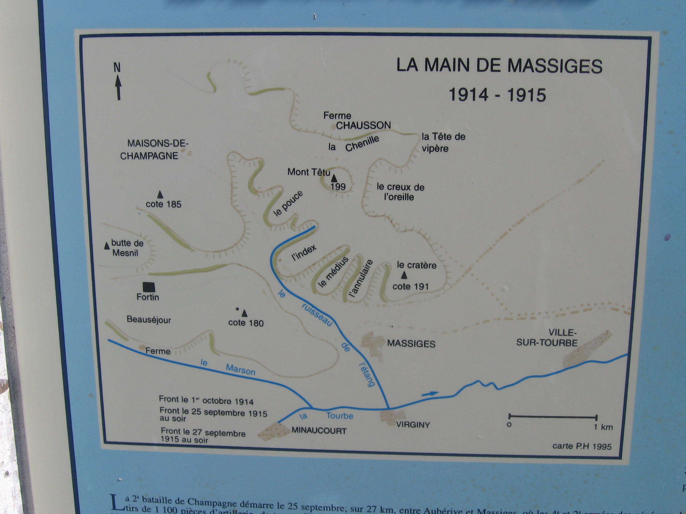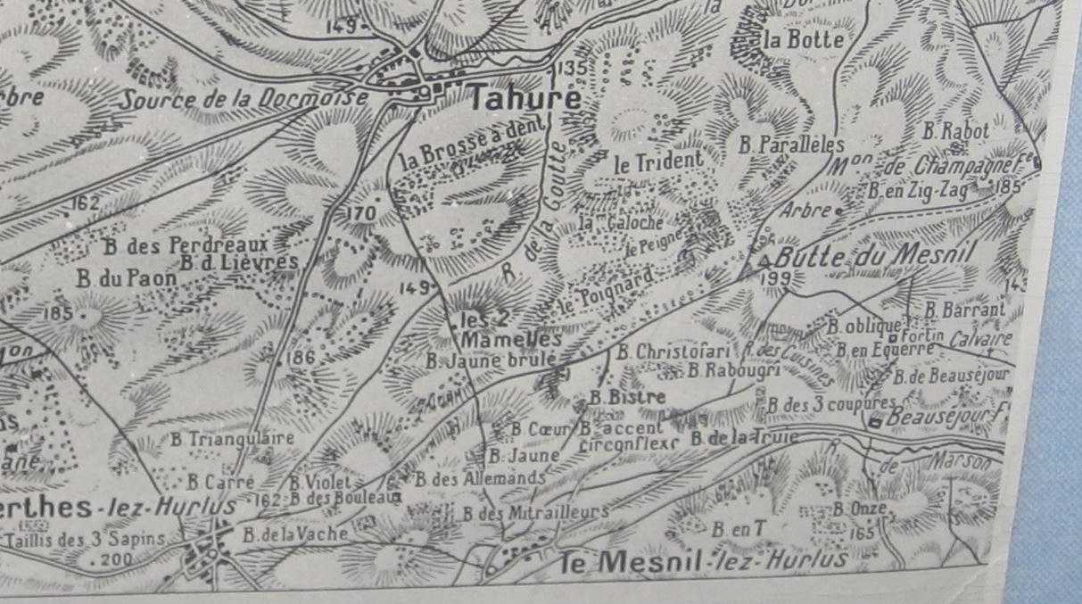 Le chemin en V, visible dans la moitié inférieure, relie Perthes-les-Hurlus - Hurlus (au sud-est de Perthes) - Le Mesnil-les-Hurlus (au nord-est de Hurlus) - La ferme de Beauséjour (à l'est, un peu après le virage) - Pont-du-Marson (à l'est de la Ferme de Beauséjour).